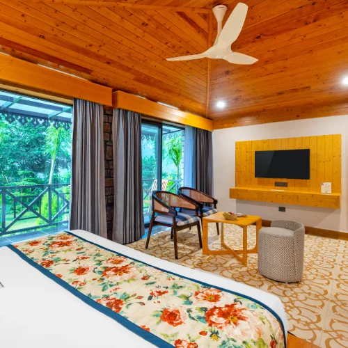For families or long-stay guests, the Anand Kutir Cottage (550 sq.ft.) offers a spacious and comfortable layout with a private balcony and Jungle views. The cottage includes a separate living space and luxury furnishings, providing a perfect home-away-from-home for families visiting Tehri Garhwal and Rishikesh. Guests can enjoy peaceful surroundings, hill views, and family-friendly amenities, making it one of the best Rishikesh resorts for families. Booking the Anand Kutir Cottage ensures a comfortable and scenic stay amidst the Himalayan foothills.